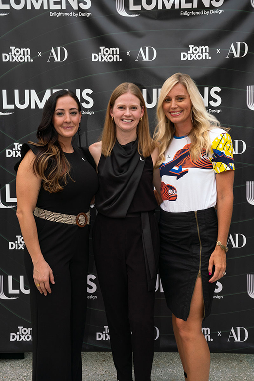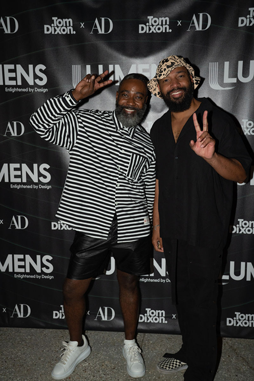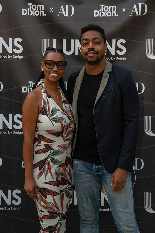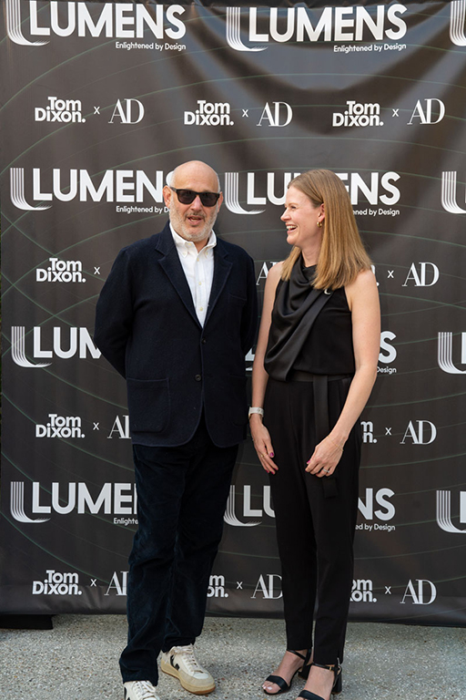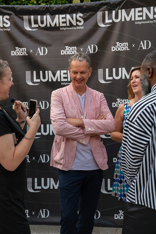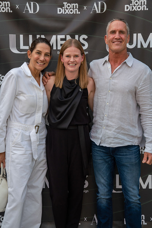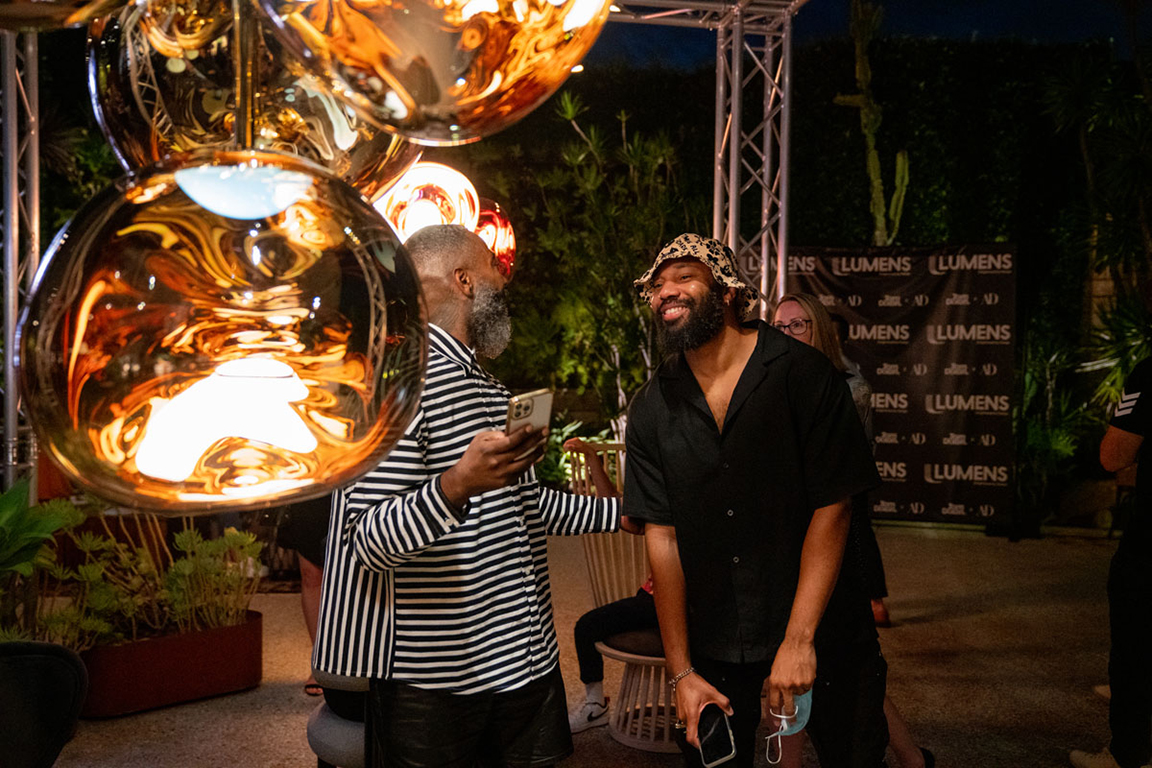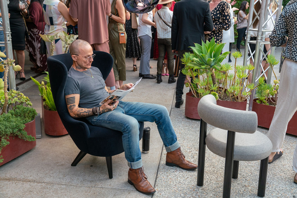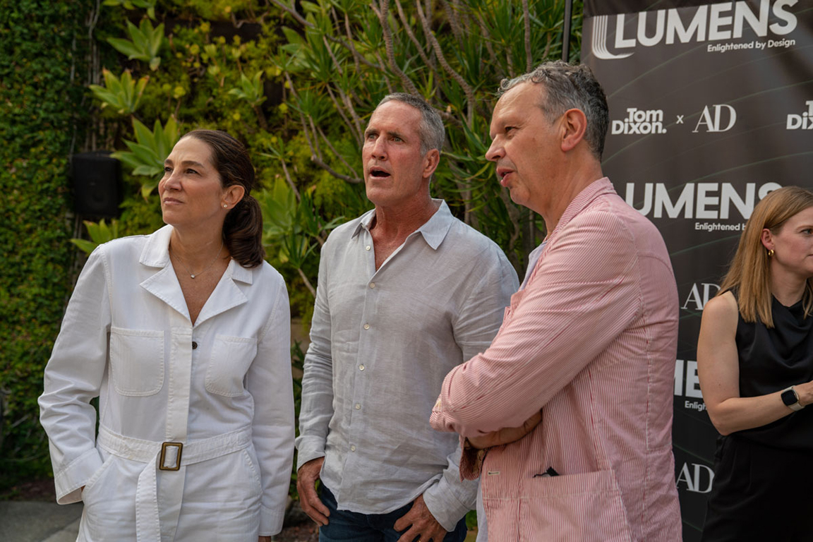 On the evening of Thursday September 8, a veritable who’s who of the Southern California A+D community gathered at the SmogShoppe in Los Angeles’ Culver City for evening hosted by Lumens in collaboration with Architectural Digest and Tom Dixon to celebrate 20 years of Tom Dixon Studio. Luscious greenery outfitted the LEED Platinum-Certified venue, powered entirely by solar panels, making for the perfect backdrop to the centerpiece displaying various Dixon furniture designs and three Melt pendants (including the Lumens exclusive in gold) suspended to eye level from a 20-foot tall structure giving guests an intimate look at his designs. The evening was capped off with a livestreamed conversation between Dixon and West Coast Editor of Architectural Digest, Mayer Rus.