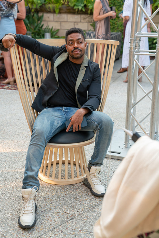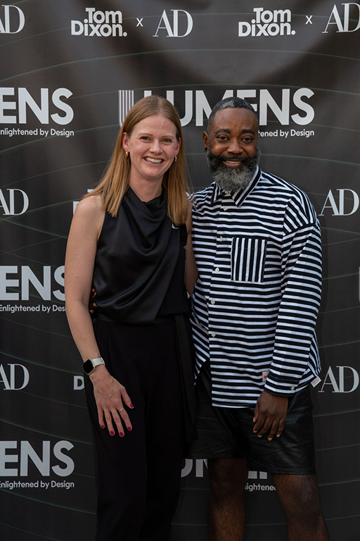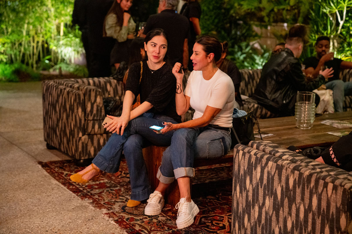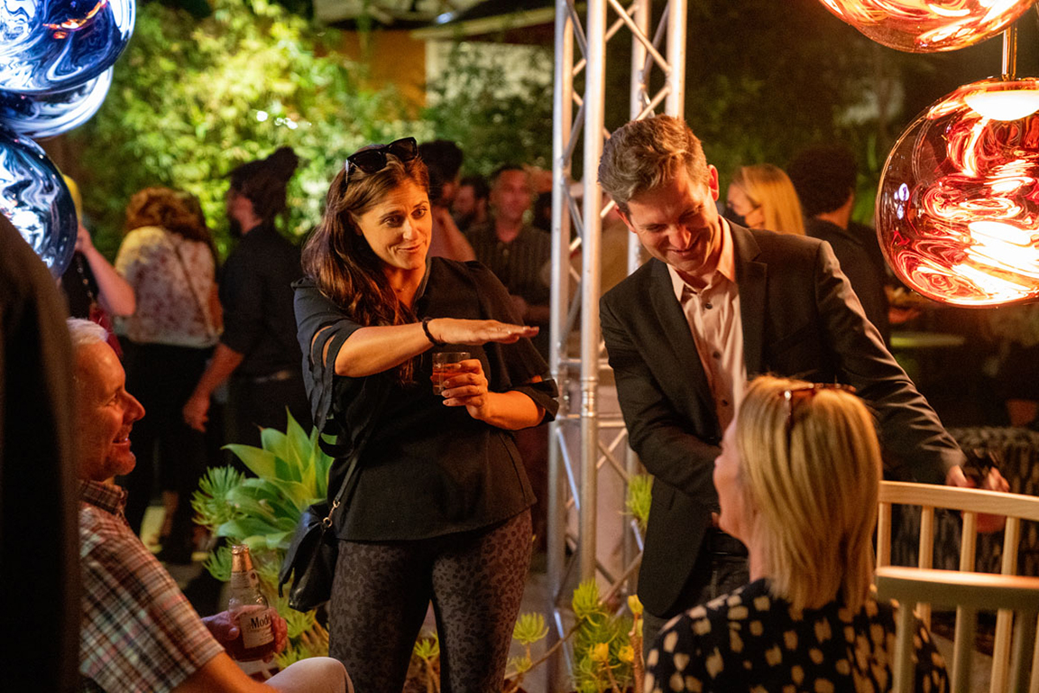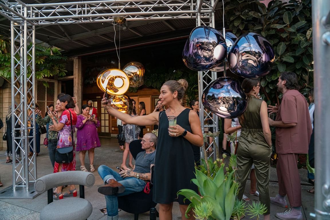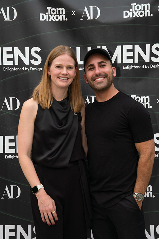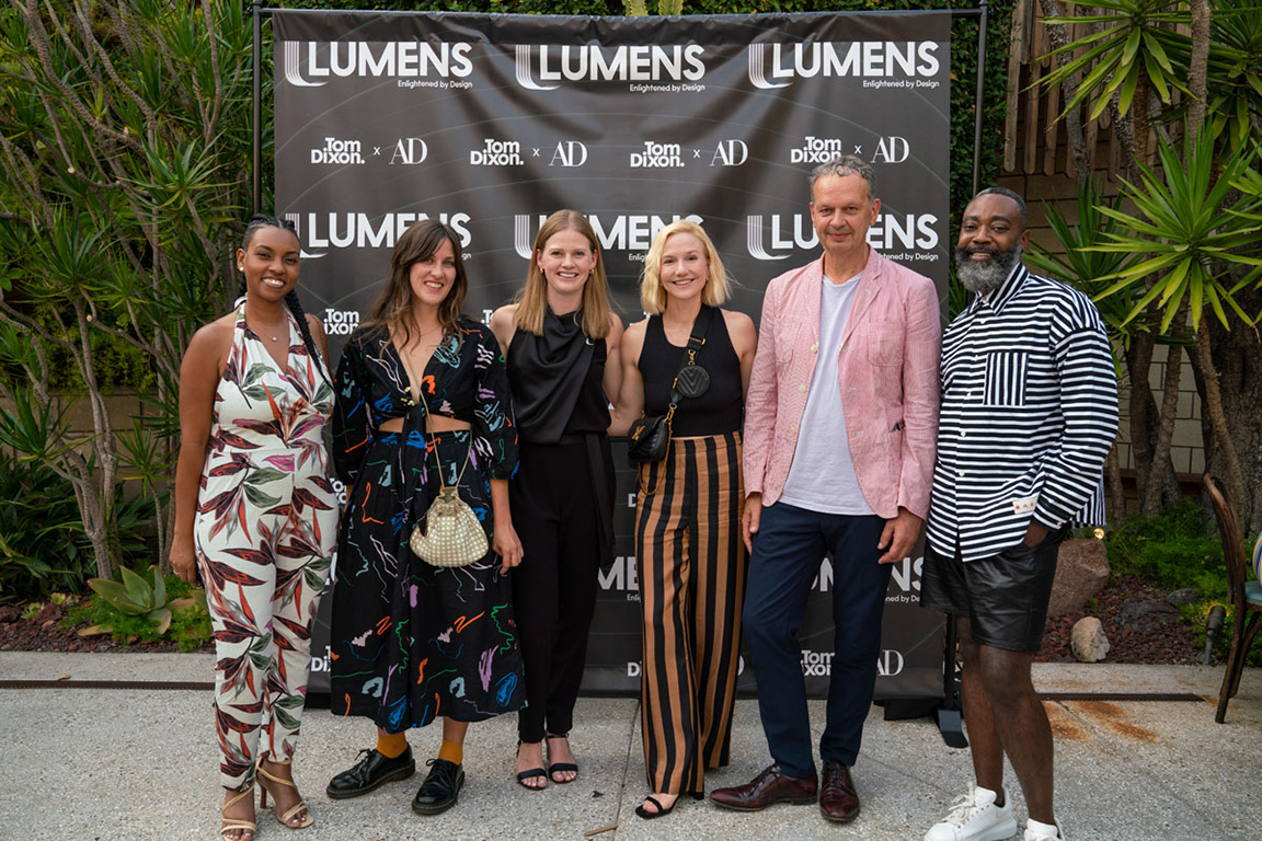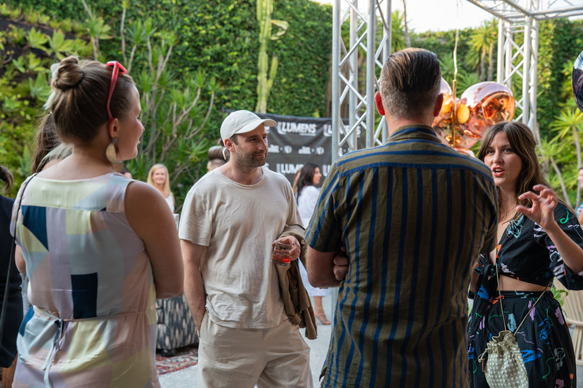 On the evening of Thursday September 8, a veritable who’s who of the Southern California A+D community gathered at the SmogShoppe in Los Angeles’ Culver City for evening hosted by Lumens in collaboration with Architectural Digest and Tom Dixon to celebrate 20 years of Tom Dixon Studio. Luscious greenery outfitted the LEED Platinum-Certified venue, powered entirely by solar panels, making for the perfect backdrop to the centerpiece displaying various Dixon furniture designs and three Melt pendants (including the Lumens exclusive in gold) suspended to eye level from a 20-foot tall structure giving guests an intimate look at his designs. The evening was capped off with a livestreamed conversation between Dixon and West Coast Editor of Architectural Digest, Mayer Rus.